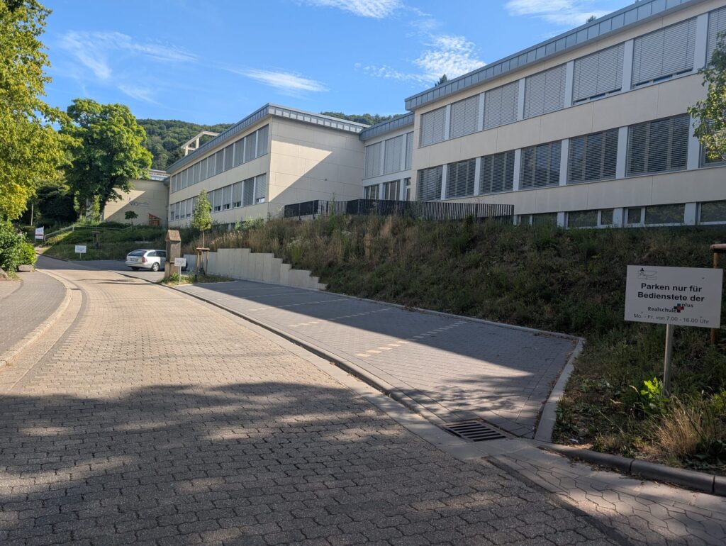 Bitte folgt dieser Straße trotz den Schildern mit der Durchfahrtsbeschränkung, folgt durch den Kreisel hindurch der Straße. Nach circa 350 Metern seid ihr bei den Parkplätzen der Schulen.
